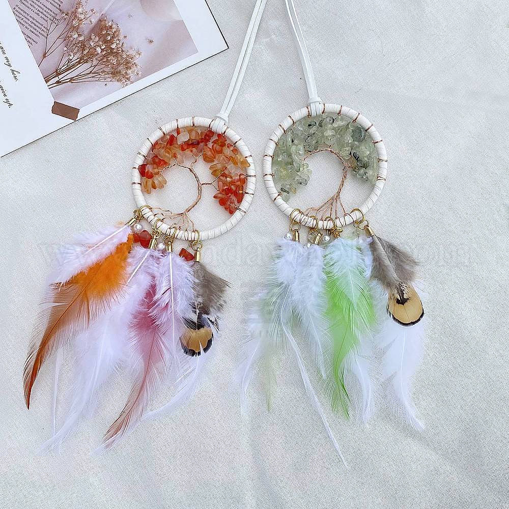 • Красный Агат Плетеная сетка/паутина с подвесками из перьев, с плоским круглым с деревом жизни натуральные сердоликовые чипсы для подвесных украшений в салоне автомобиля, 400 мм