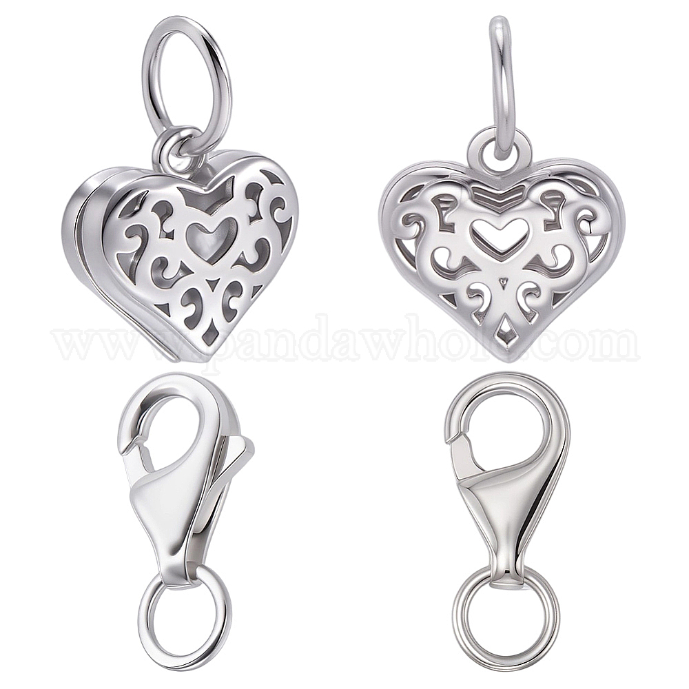 2шт. полые, покрытые родием 925 подвески в форме сердца из стерлингового серебра, с соединительными кольцами и 2шт. карабинами, анти-тускнение (02YSCN)