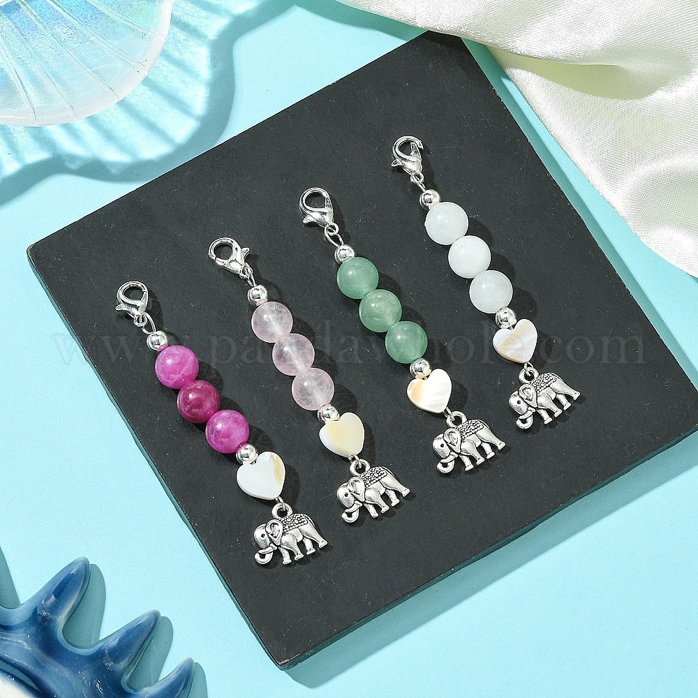 • (52) Непрозрачная лаванда Подвесные украшения из сплава в виде слона и пресноводных ракушек, с круглыми бусинами из натурального белого нефрита, зеленого авантюрина, кварца и малайзийского нефрита, разноцветные, 67.5 мм