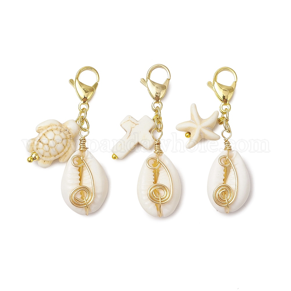 Подвесные украшения из натуральных смешанных ракушек каури, Застежка-лобстер и подвески в виде черепахи и морской звезды из синтетической бирюзы для украшения сумок (031DQC)