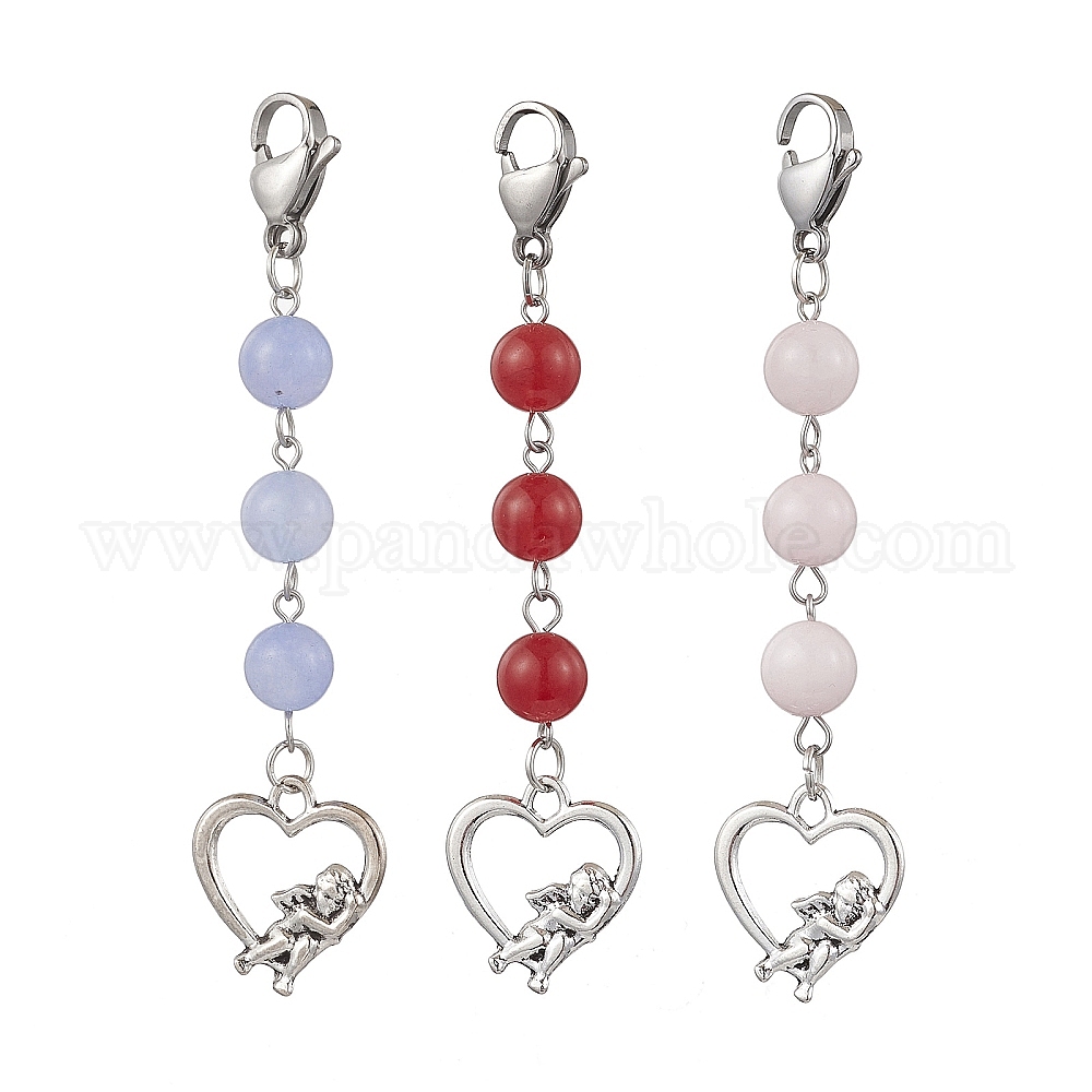 • Смешанные камни Подвесные украшения из сплава в форме сердца, круглые подвески из натурального кварца, розового кварца, окрашенного малайзийского нефрита и застежки-клешни лобстера для украшений сумок, 79.5 мм, 3 шт / комплект