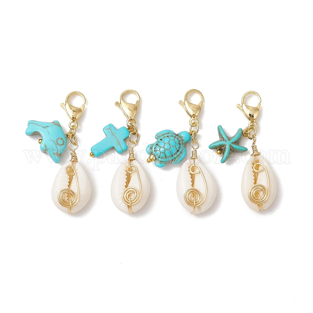 • Золотой Подвески из натуральных ракушек, Застежка-лобстер и подвески в виде морской звезды, креста, черепахи, дельфина из синтетической бирюзы для украшения сумок, золотые, 43.5~48.5 мм, 4 шт / комплект