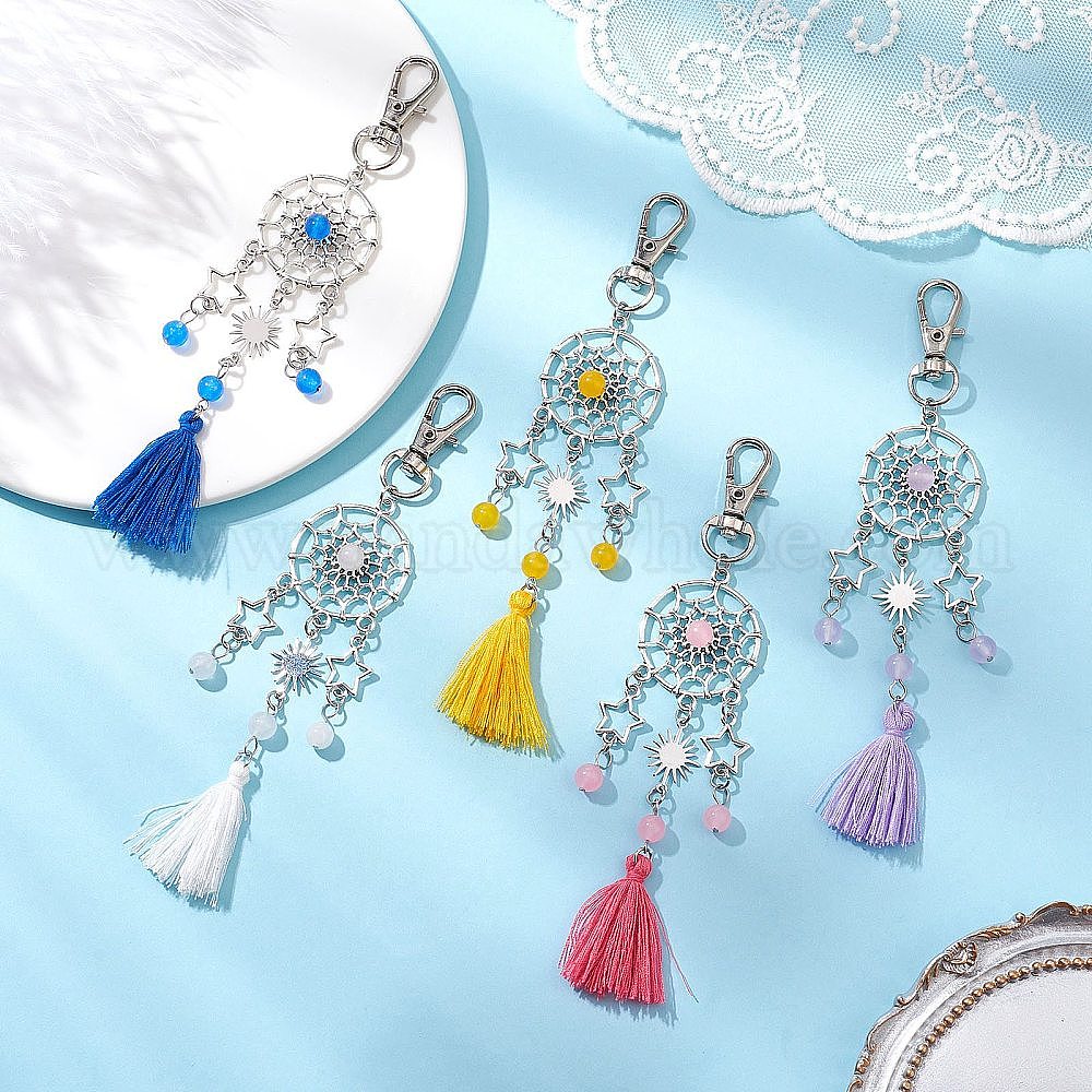 Подвеска из натурального и окрашенного малайзийского нефрита и сплава, поворотные застежки и подвески-кисточки из поликоттона для украшений сумок, плоский круг/паутина со звездой и солнцем