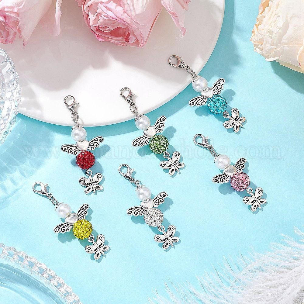 6 шт. 6 цвета подвеска в виде ангела и бабочки из сплава с бусинами и полимерной глиной, украшенная стразами, Сплав с застежками когтя омара