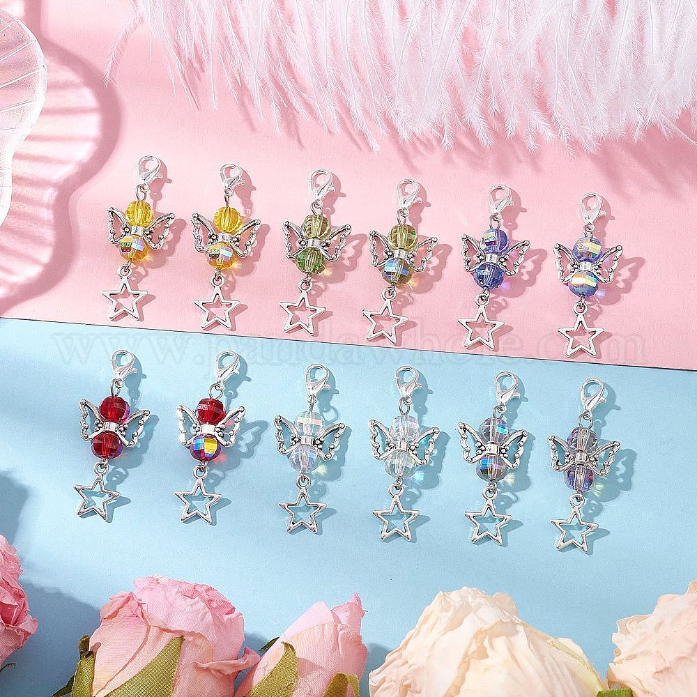 12 шт 6 цвета прозрачные гальванические стеклянные подвесные украшения, с застежками-карабинами и бусинами из сплава, ангел и звезда
