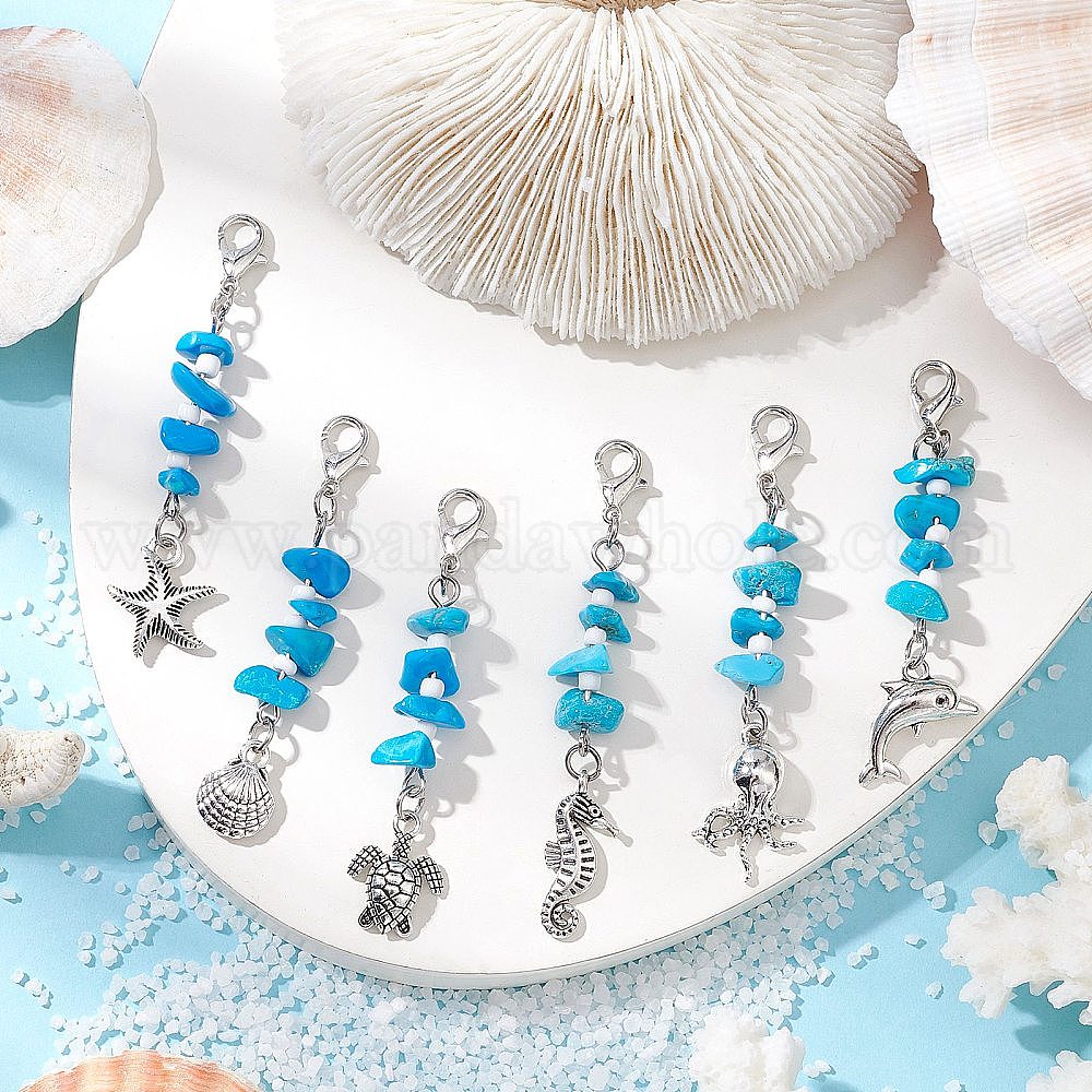 Подвесные украшения из сплава в тибетском стиле с морскими животными, с синтетической бирюзовой крошкой и стеклянными бусинами, застежками-лобстерами