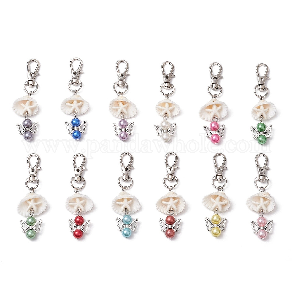 • Античный Серебристый & Платиновый Подвеска в виде ангела из акрила и синтетической бирюзы, морская звезда и ракушка, Поворотные застежки-когти-омары для украшения сумок, старинное серебро и платина, 72~73 мм, 12 шт / комплект