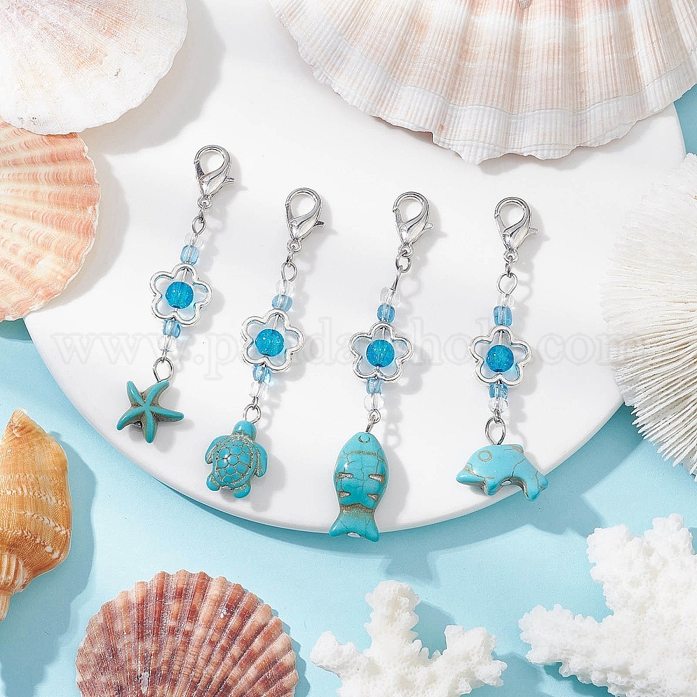 Подвеска в виде морской звезды, черепахи, рыбы, дельфина из синтетической бирюзы, со стеклянными бусинами из цветочного сплава и застежками-клешнями