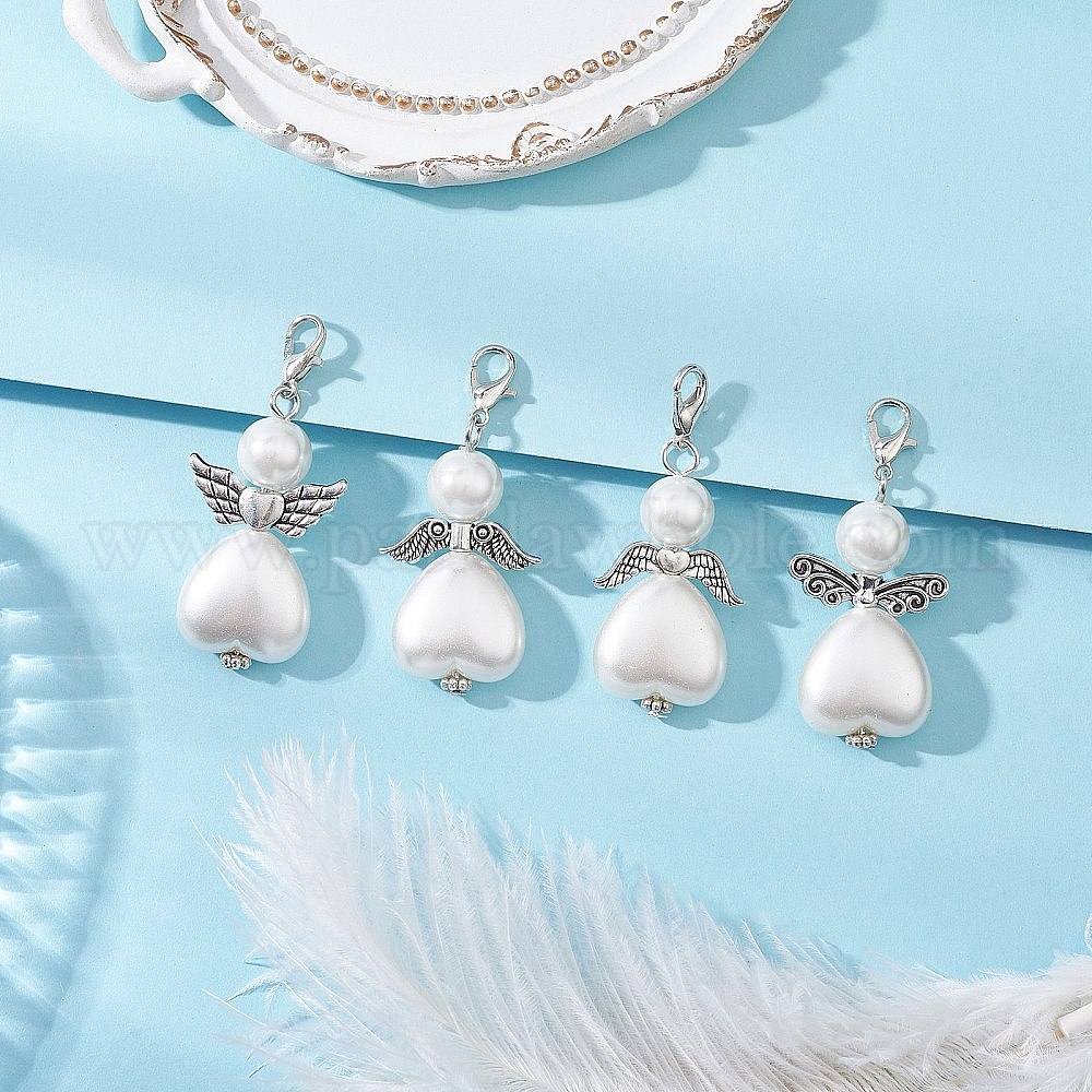 4 шт. 4 стили абс пластик искусственный жемчуг и стеклянный жемчуг сердце ангел подвеска украшения, с крыльями из сплава и застежками-клешнями, белые