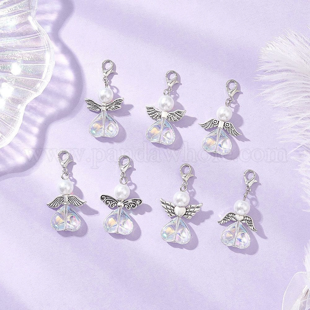 • Античный Серебристый & Платиновый Подвеска в форме сердца ангела из стекла и стеклянного жемчуга, с цинковым сплавом застежками омаров коготь, старинное серебро и платина, 40~41 мм, 7 шт / комплект