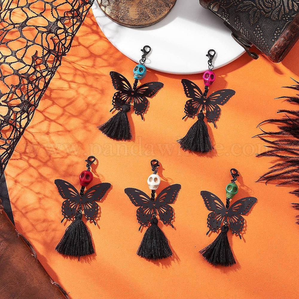 Синтетическая бирюза подвеска украшение, череп с бабочкой, с застежками-карабинами из цинкового сплава и подвесками-кисточками