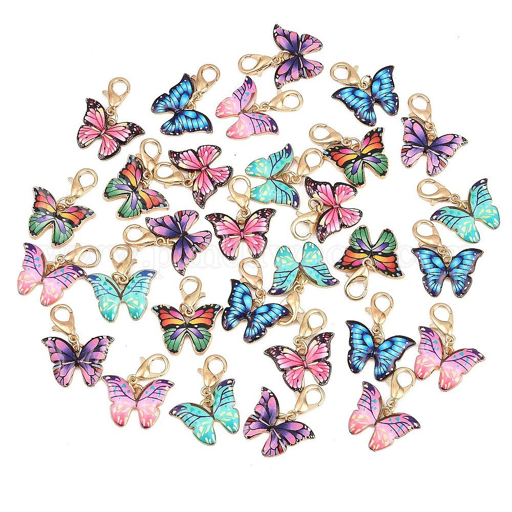 30шт 6 цветной сплав эмали кулон украшения, бабочка, Сплав с застежками когтя омара, золотой свет (035Y6E)