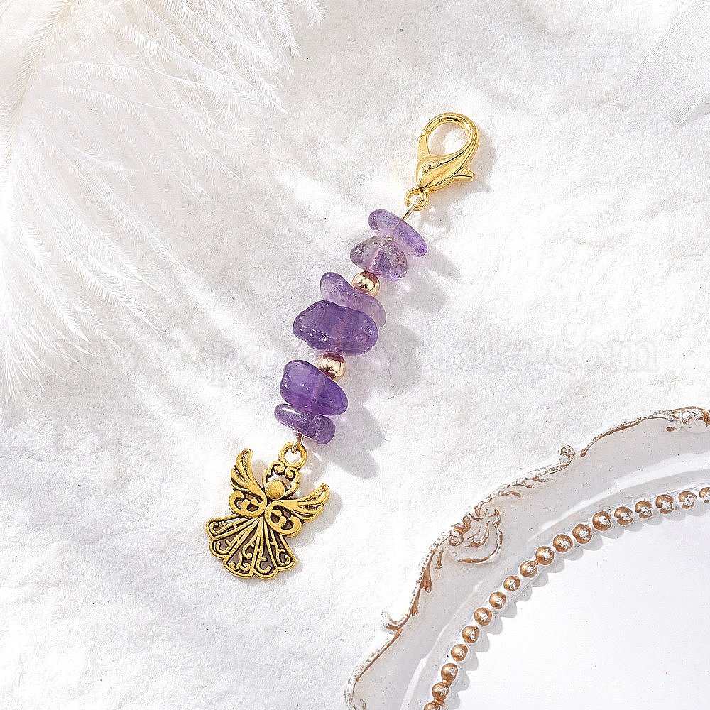 • Аметист Подвесные украшения в виде ангела из сплава в тибетском стиле, с натуральными аметистовыми вкраплениями и застежками-лобстерами из цинкового сплава, 70~72 мм