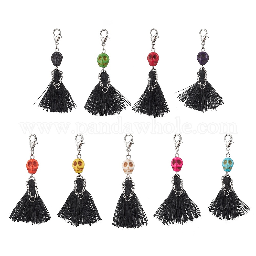 Подвеска с кисточкой из окрашенного синтетического бирюзового черепа и поликоттона на Хэллоуин, Сплав с застежками когтя омара, платина