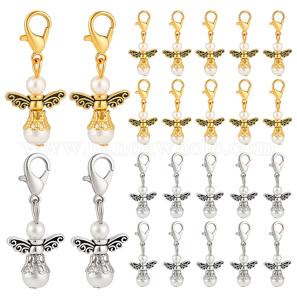 40 шт. 2 цветные стеклянные перламутровые и сплавные подвесные украшения в виде ангела, Сплав с застежками когтя омара