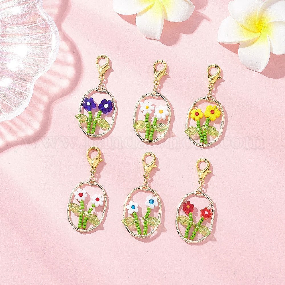 Овальный с цветочным стеклянным бисером и подвесками из лэмпворка и сплава, с карабин-лобстерами , золотые