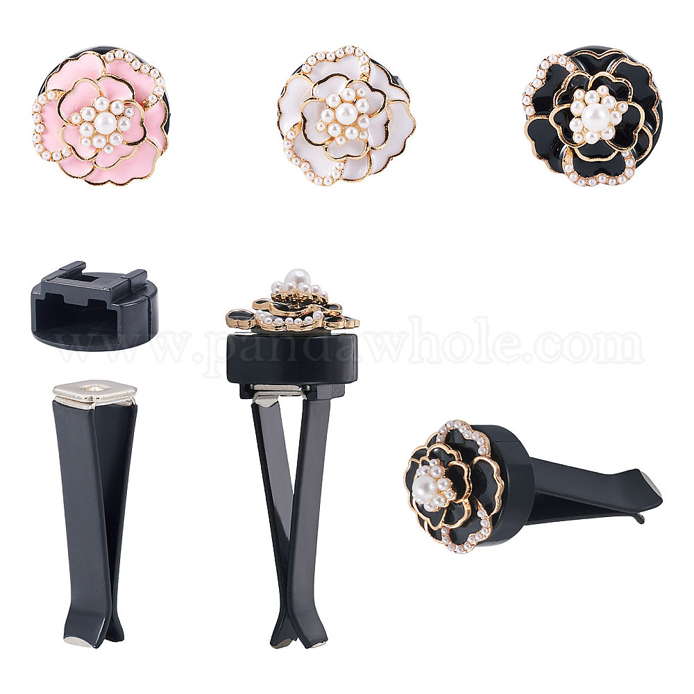 Комплекты зажимов для вентиляционных отверстий, В комплекте 3 шт. 3 цветные кабошоны из сплава с эмалью в виде цветка, в комплекте 3шт. железный зажим для вентиляционного отверстия и пластиковый слот для карты