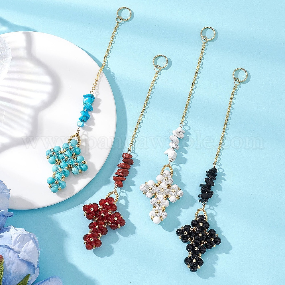 Подвески-кресты из бисера и крошки драгоценных камней, с латунными плоскими овальными тросовыми цепями