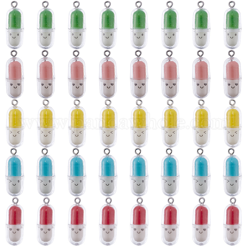 40шт 5 цвета полупрозрачные пластиковые подвески, очарование капсулы таблетки, с платиновыми тоновыми железными петлями (02JA5X)
