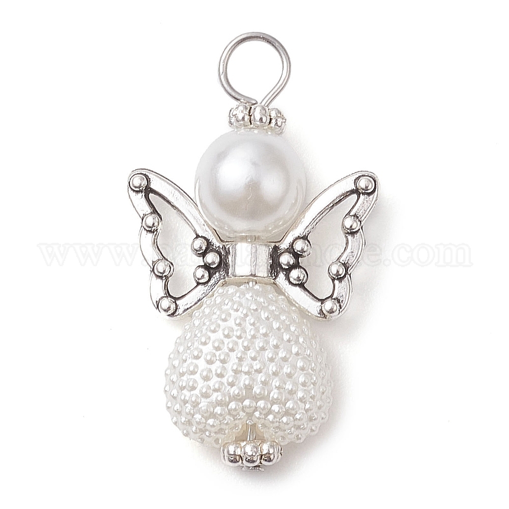 • Античное Серебро Подвески из искусственного жемчуга, Сплав с поиска, ангельские прелести, белые, античное серебро, 31x18x7.5 мм, отверстие : 4 мм