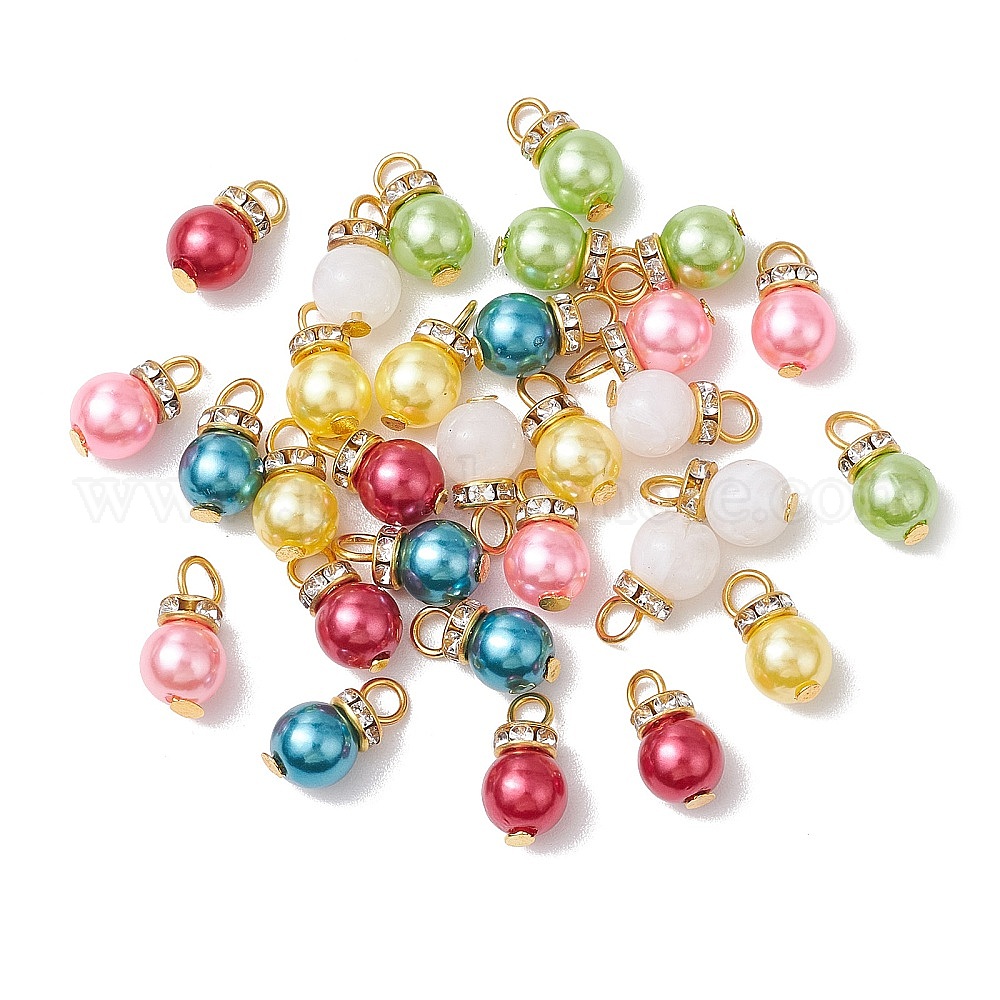 30шт 6 цвета АБС пластик имитация жемчуга подвески, с железными бусинами-разделителями из стразов и железными штифтами, круглые подвески