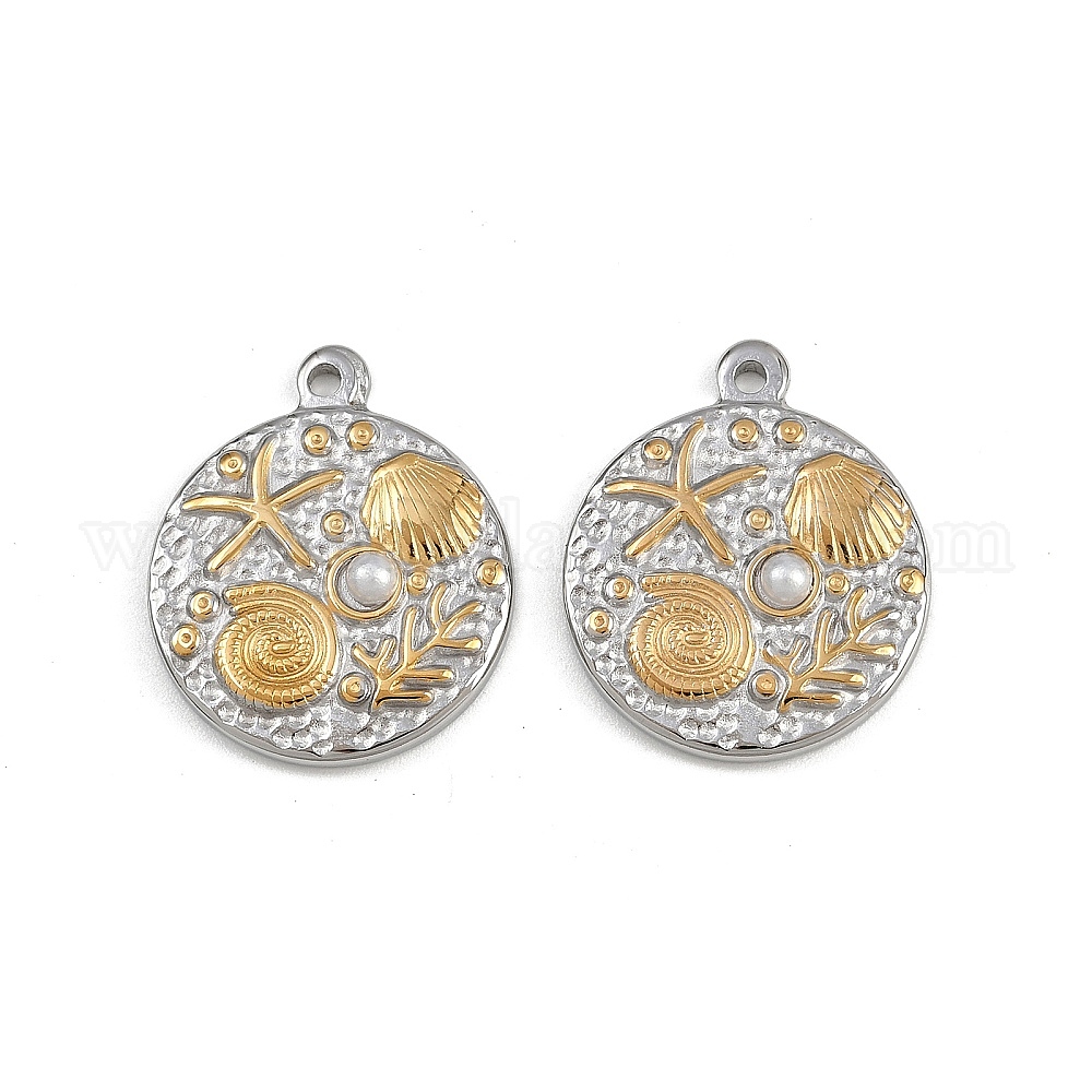 304 подвески из нержавеющей стали, плоский круг в форме ракушки и морской звезды, с абс пластмассовыми жемчужными бисером, ионное покрытие (ip)