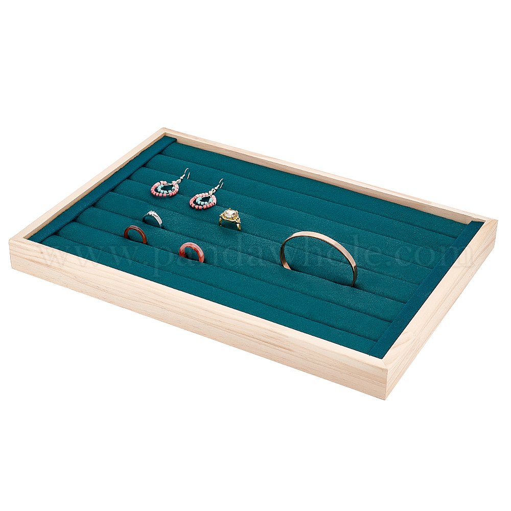 • Темно-Зеленый 7-слотовые прямоугольные подставки для деревянных колец, органайзер для колец на пальцы, с бантиком, темно-зеленый, 35.5x24.3x3 см, Внутренний диаметр: 34x22.7 cm