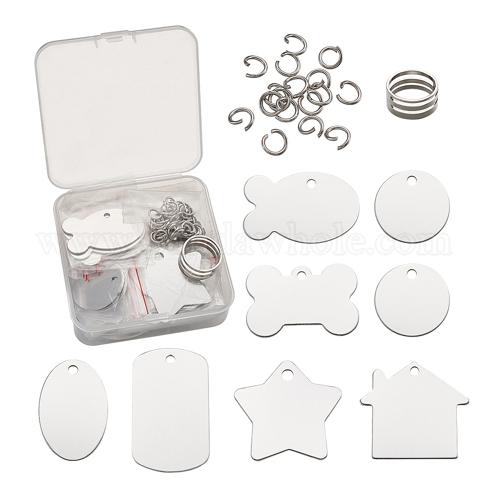 Алюминиевые подвески, штамповка пустой метки, с 304 кольцами из нержавеющей стали и вспомогательным инструментом из латуни, звезда и дом, рыба, овал, кость, прямоугольник и плоский круг
