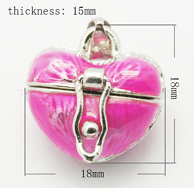 • Темно-Розовый Латунные подвески коробки молитве, эмаль, сердце, платина, темно-розовыми, 18x18x15 мм, отверстие : 4x6 мм