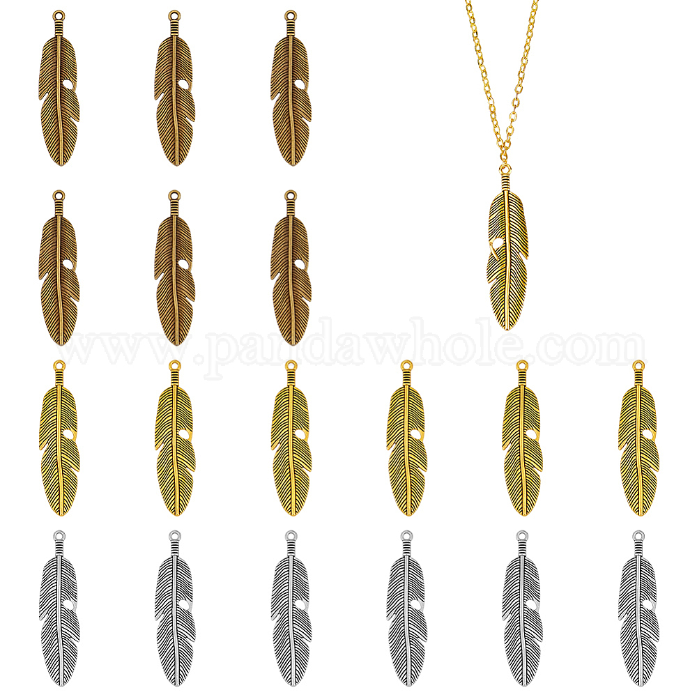 18шт 3 цвета тибетский стиль сплав перья подвески, без свинца и без кадмия, 61x15x3 мм, отверстие : 2 мм