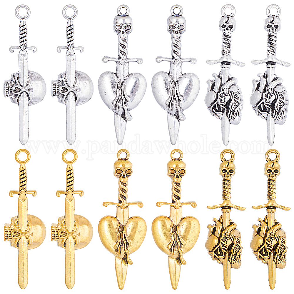 • Античный Серебрянный & Античный Золотой 36 шт 6 стиль тибетского сплава большие подвески, меч с подвеской в виде черепа/сердца, старинное серебро и античный золотой, 49~55.5x17~18.5x5~7 мм, отверстие : 2~3.2 мм, 6 шт / стиль