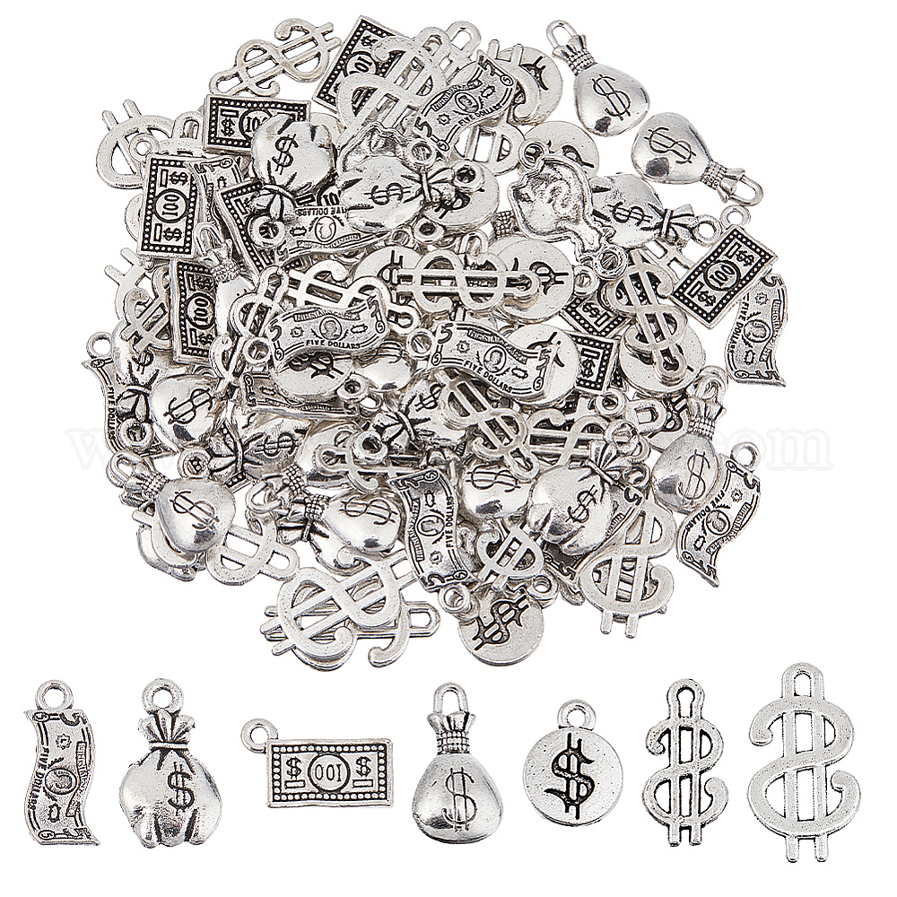 98 шт. 7 стили подвески из сплава в тибетском стиле с денежной тематикой, античное серебро