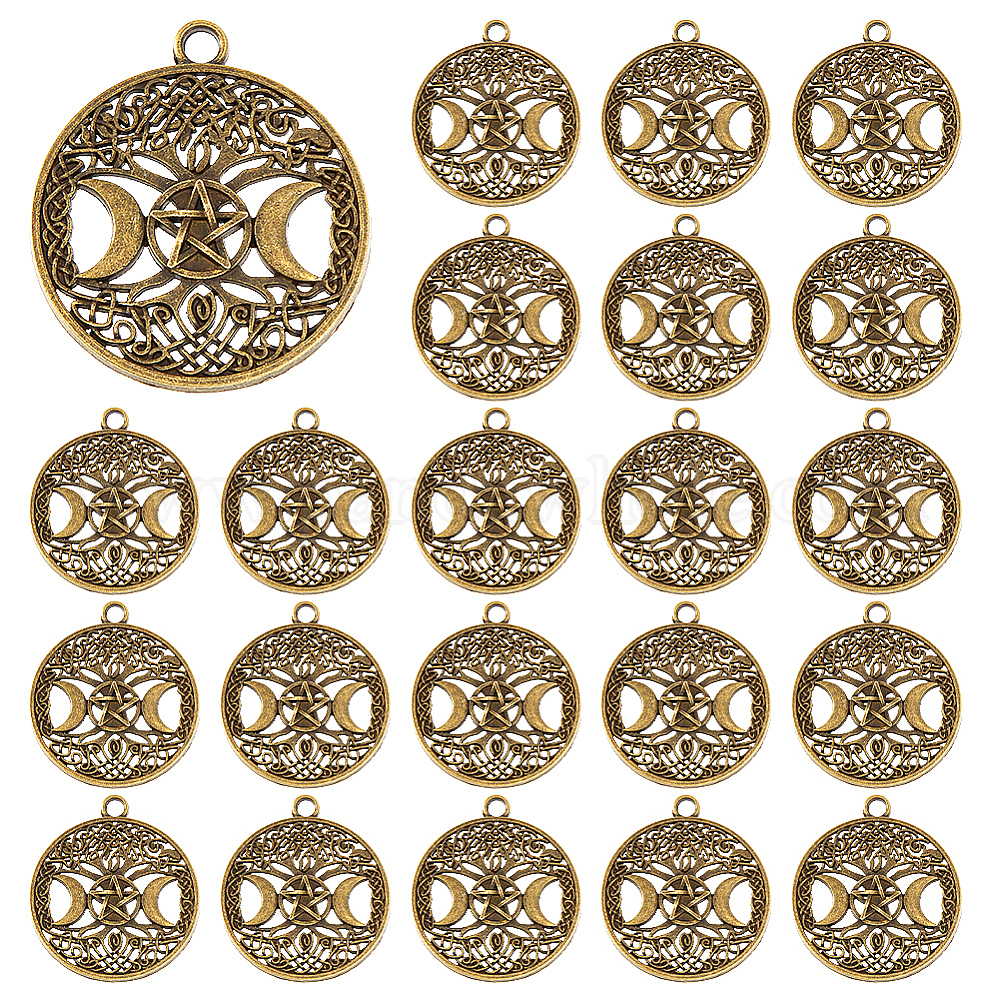 • Античная Бронза 30шт. подвески из полого сплава в тибетском стиле, плоский круг с богиней тройной луны, языческие украшения, античная бронза, 39x34x1.5 мм, отверстие : 3 мм