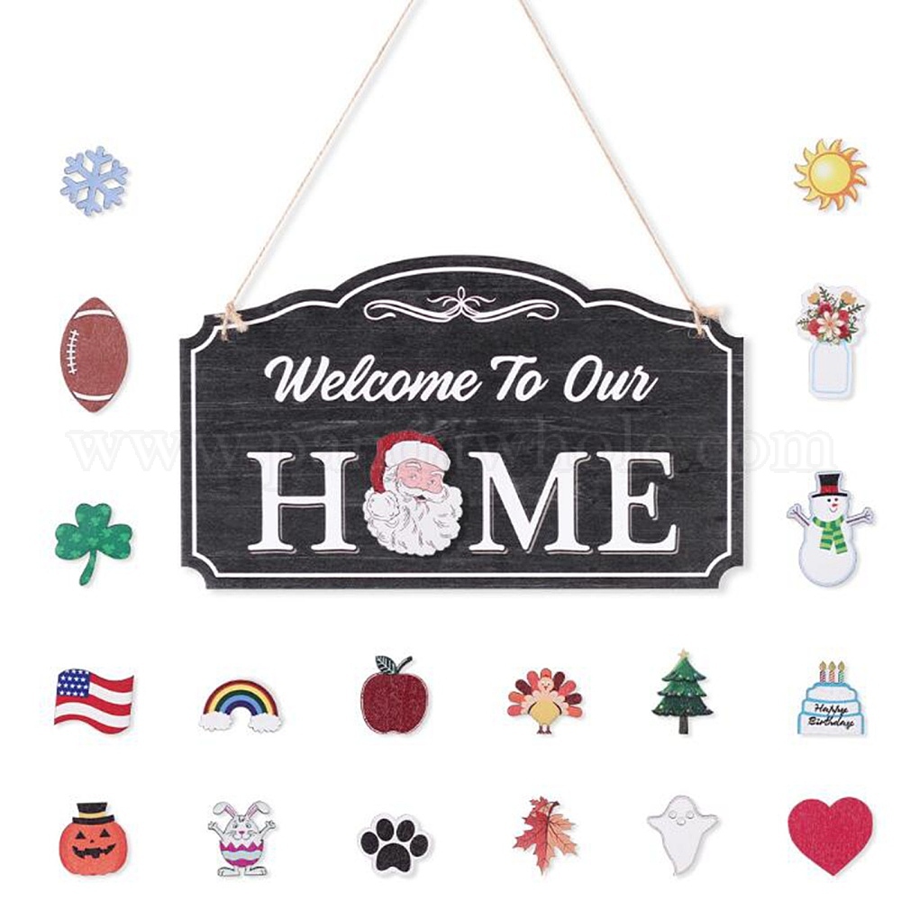 • Разноцветный Настенные украшения из натурального дерева для украшения дома входной двери, с джутовым шпагатом, прямоугольник со словом добро пожаловать в наш дом, красочный, 295x175x2.29 мм