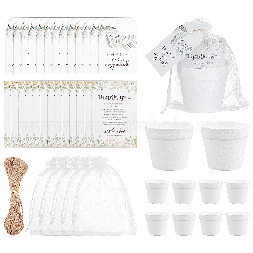 Свадебные принадлежности, включая бумажные благодарственные открытки, пластиковые имитационные цветочные горшки для украшения витрин, подарочные пакеты из органзы и бумажные бирки для подарков