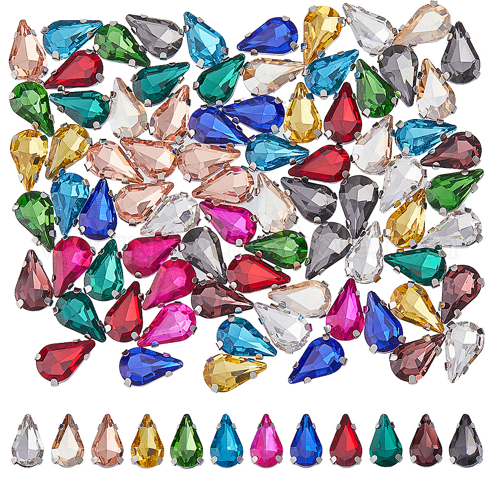 96шт 12 цвета каплевидные пришивные стразы, многожильных ссылки, стекло горный хрусталь, с настройками латуни, аксессуары для одежды, граненые