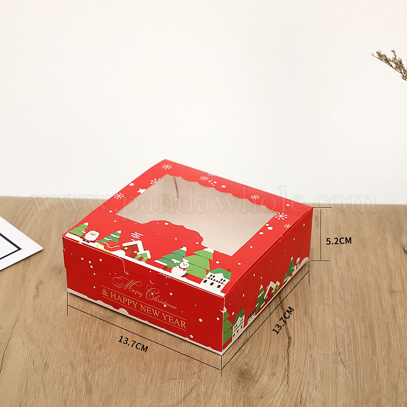 • Снеговик Бумажная коробка для торта, квадратный с 4 отделением и прозрачным окном, коробка для упаковки кексов для выпечки, снеговик, 137x137x52 мм