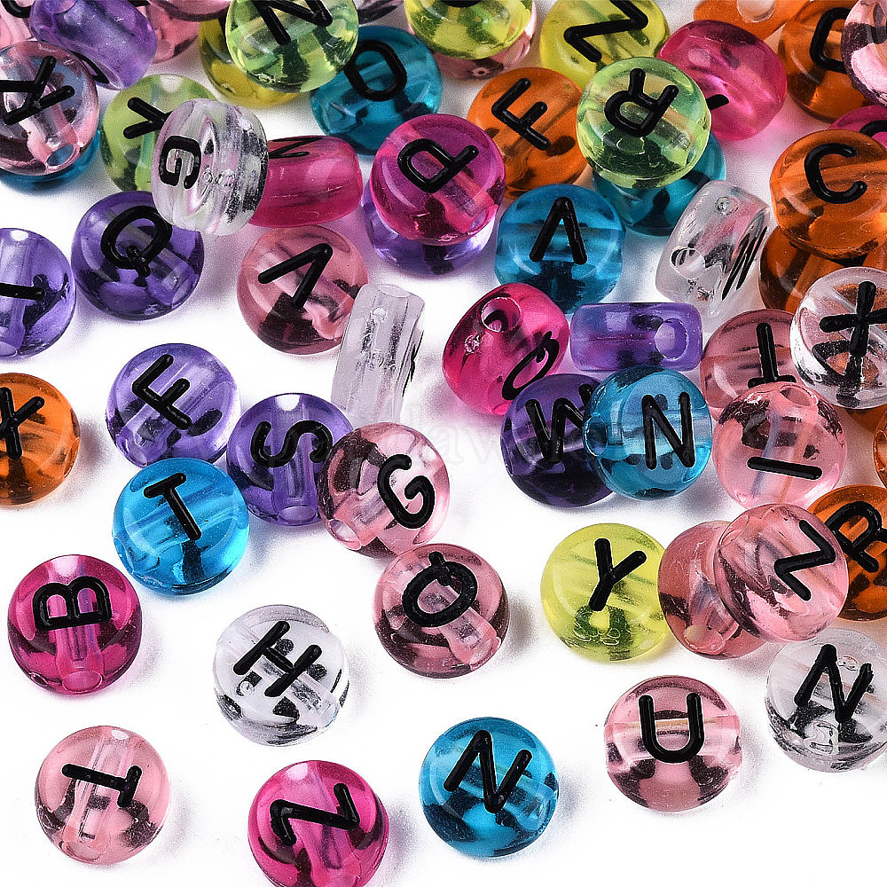 • (52) Непрозрачная лаванда Прозрачные разноцветные акриловые бусины, горизонтальное отверстие, плоский круглый с черной случайной буквой, 7x4 мм, отверстие : 1.8 мм, Около 3600~3700 шт / 500 г