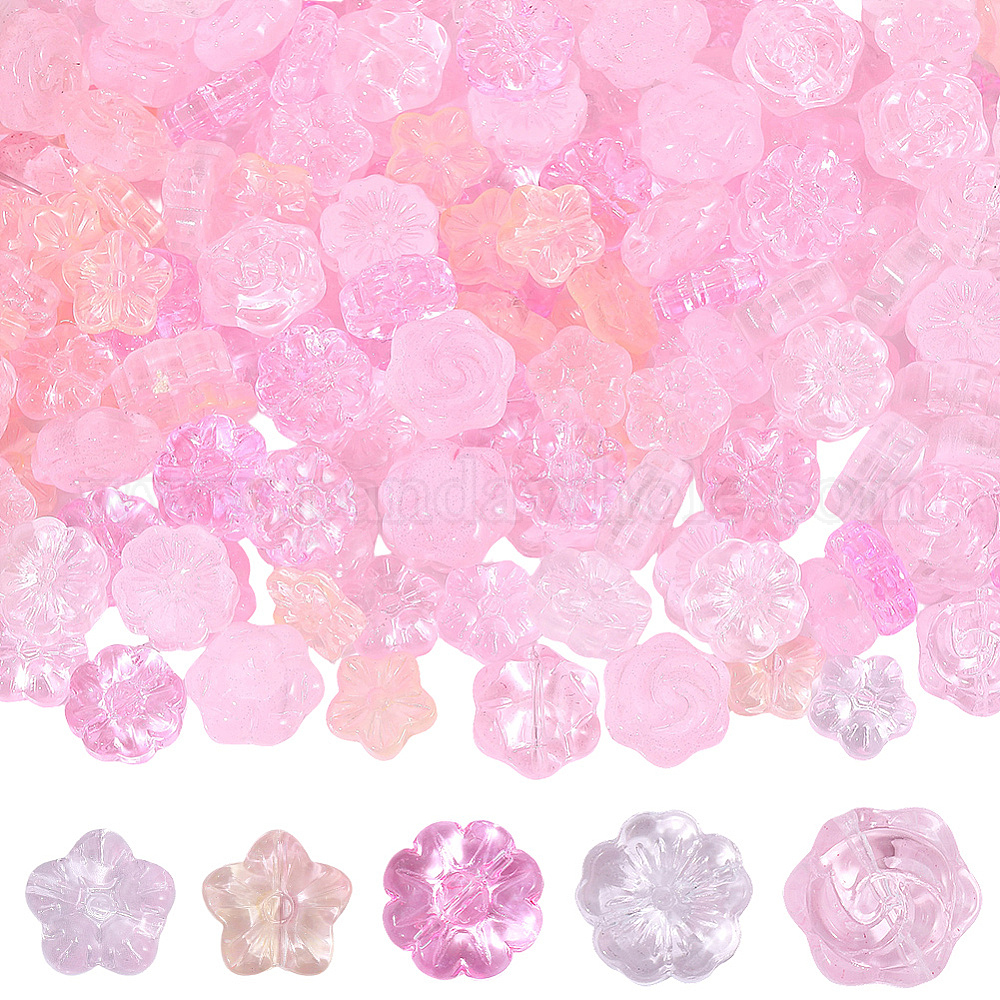 • Pink 150шт 5 стиль стеклянные бусины, цветок, розовые, 12.5~14.5x4.5~8 мм, отверстие : 1~1.2 мм, 30 шт / стиль