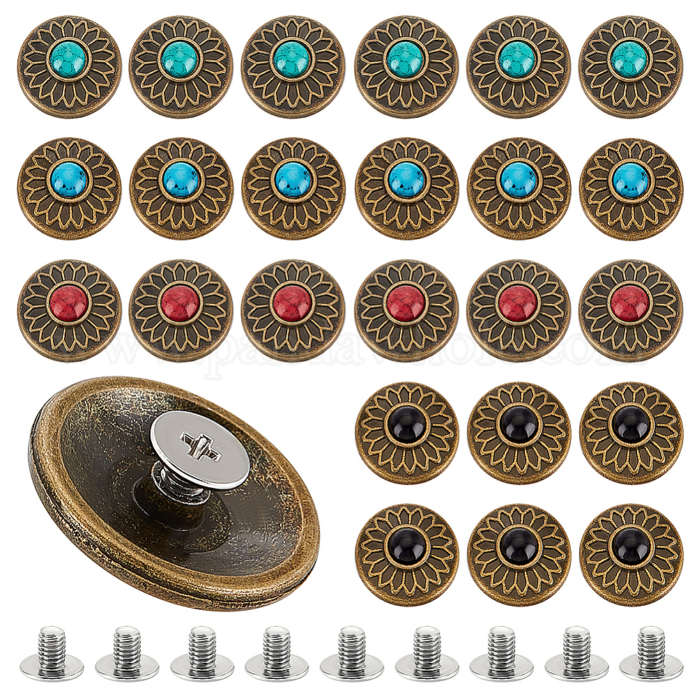 24шт 4 цвета литые кнопки, с имитацией синтетической бирюзы и винтом, для кошелька, , украшение кожаных ремесел, плоские круглые с цветком