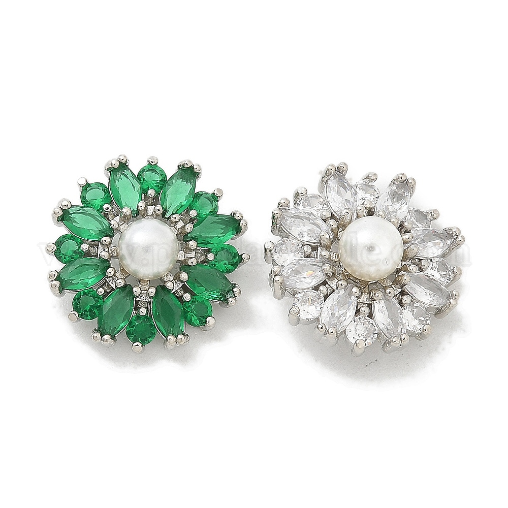 Стойка гальванопокрытие латунные кнопки с микропаве из кубического циркония, с ABS имитации жемчуга, долговечный, без свинца и без кадмия, плоско-круглые, платина, 1-луночное