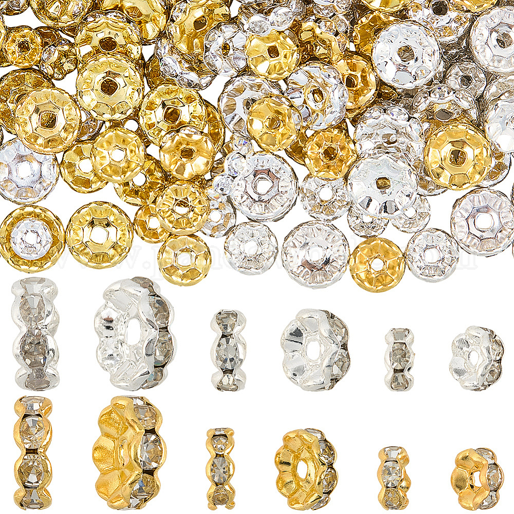 300шт 6 стили латунные бусины со стразами, класс А, волнистый край, золото , рондель