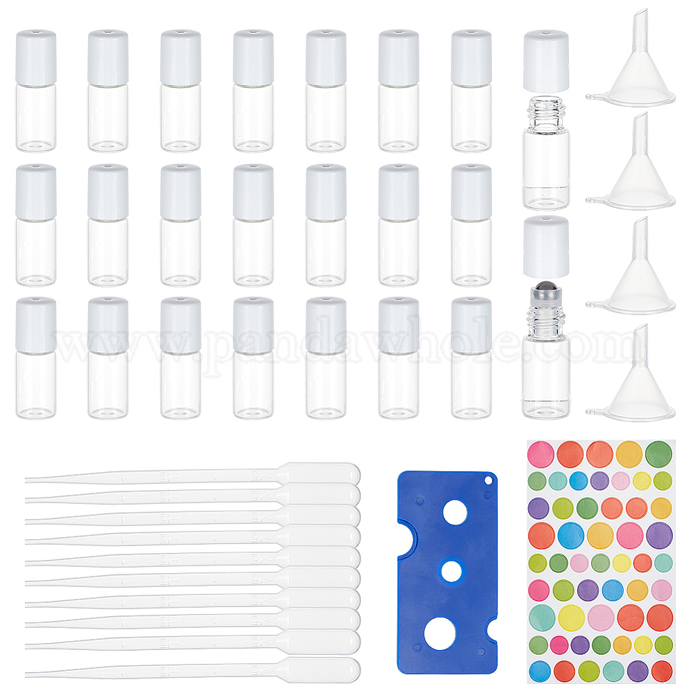 24шт. прозрачные стеклянные бутылки-роллеры, с 1 открывалками для пластиковых бутылок, 10 пипеткой и 4 воронкой, 1 цветные радужные наклейки из поликарбоната