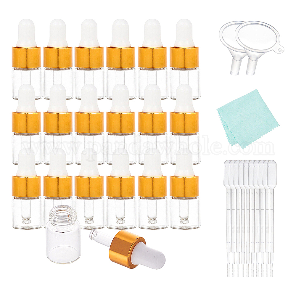 • Прозрачный Пустые стеклянные флаконы-капельницы, для эфирных масел ароматерапия лабораторные химикаты, с одноразовыми пластиковыми пипетками для переноса, мини прозрачная пластиковая воронка и серебряная полировочная ткань, прозрачные, 43x16 мм, мощность: 2 мл
