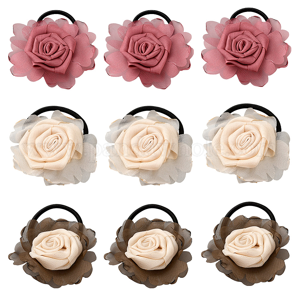 9 шт. 3 Цвета полиэстеровые аксессуары для волос, цветок, с эластичным шнуром, резинка для волос / резинки для волос