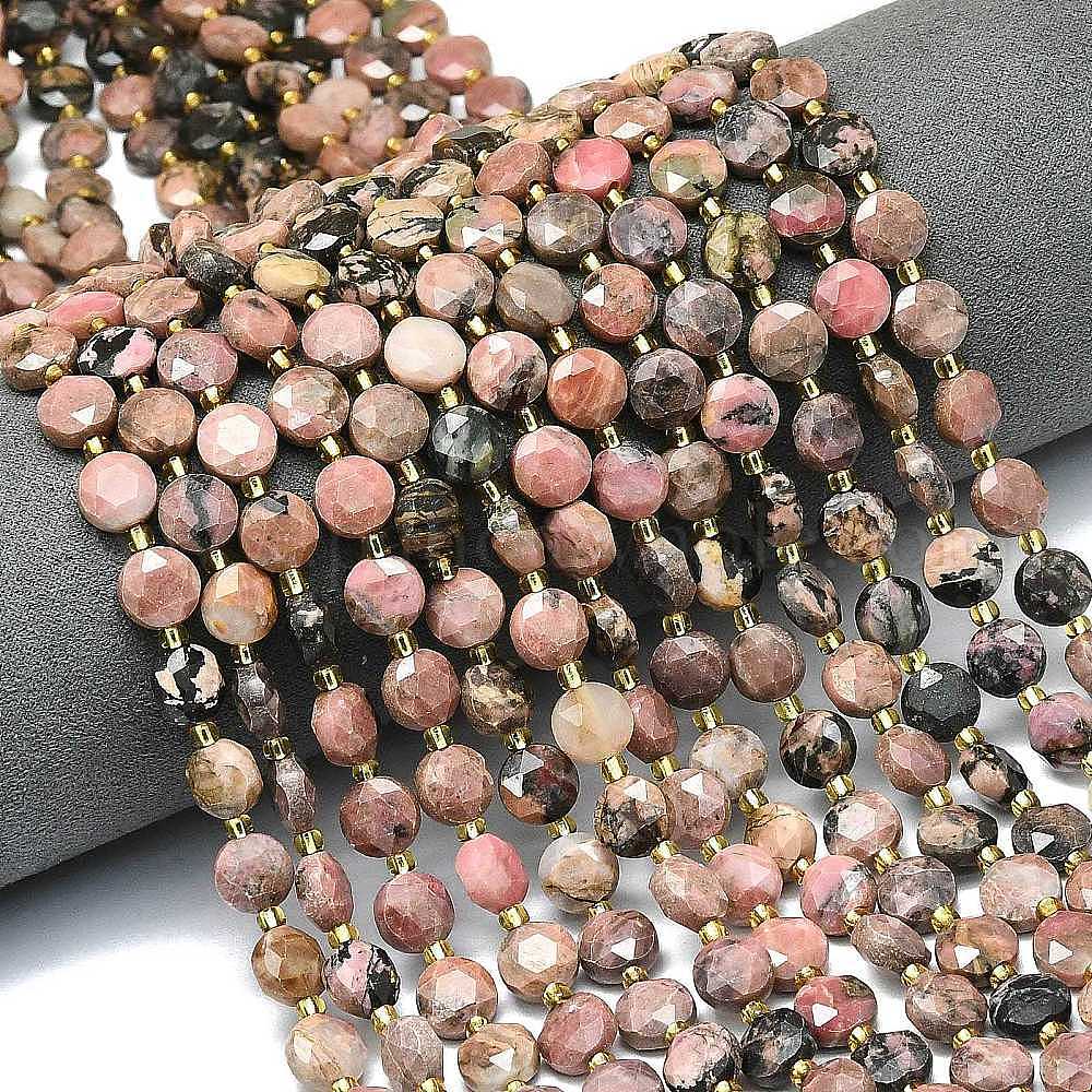 Природные родонит бисер нитей, граненый шестиугольный разрез, плоско-круглые, с бисером