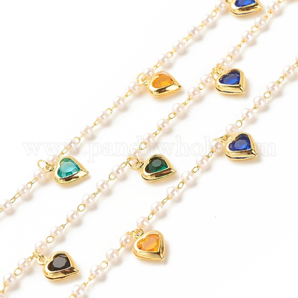 • Разноцветный Латунные кабельные цепи, с жемчугом из бисера и стеклянными сердечками, долговечный, пайки, с катушкой, красочный, 5x3 мм