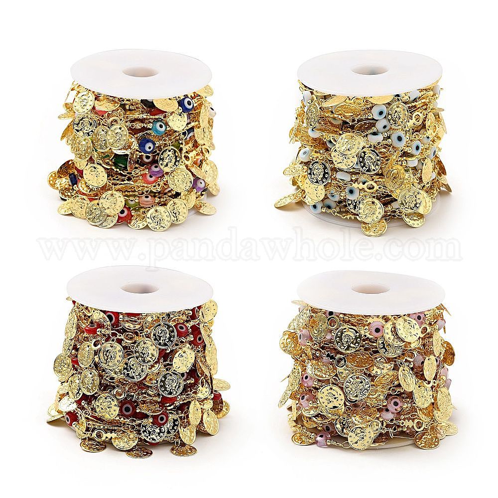 • Разноцветный Стеклянные плоские круглые с эмалевыми цепочками от сглаза, с настоящей позолоченной латунной цепочкой с подвесками для монет 18k, без свинца и без кадмия, пайки, с катушкой, красочный, 19x6x3 мм, 13x5x1 мм