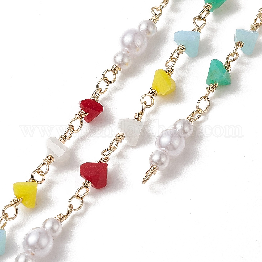 Цепочки ручной работы из пластика и стекла с имитацией жемчуга и треугольными бусинами, с реечной накладкой из позолоченной латуни, несварные, с карточной бумагой