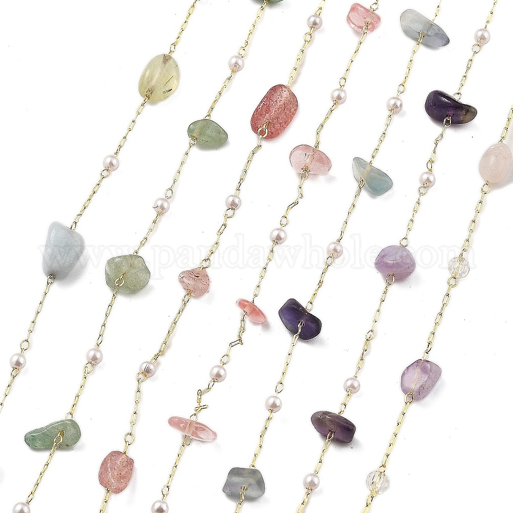 • Клубничный Кварц Цепочки из натурального клубничного кварца и стекла, с медными цепями, стойки покрытие, долговечный, без свинца и без кадмия, реальный 18 k позолоченный, пайки, с катушкой, 3~4x4.5~11x4.5~11 мм